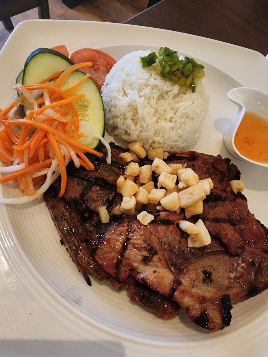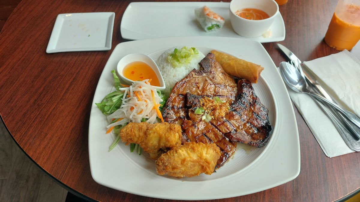 We were in the area so we stopped by for lunch. We found parking a couple blocks away. Service was fast. Iced Vietnamese coffee was good. I appreciate the portion sizes. Garlic noodles were great. Shrimp was grilled well.