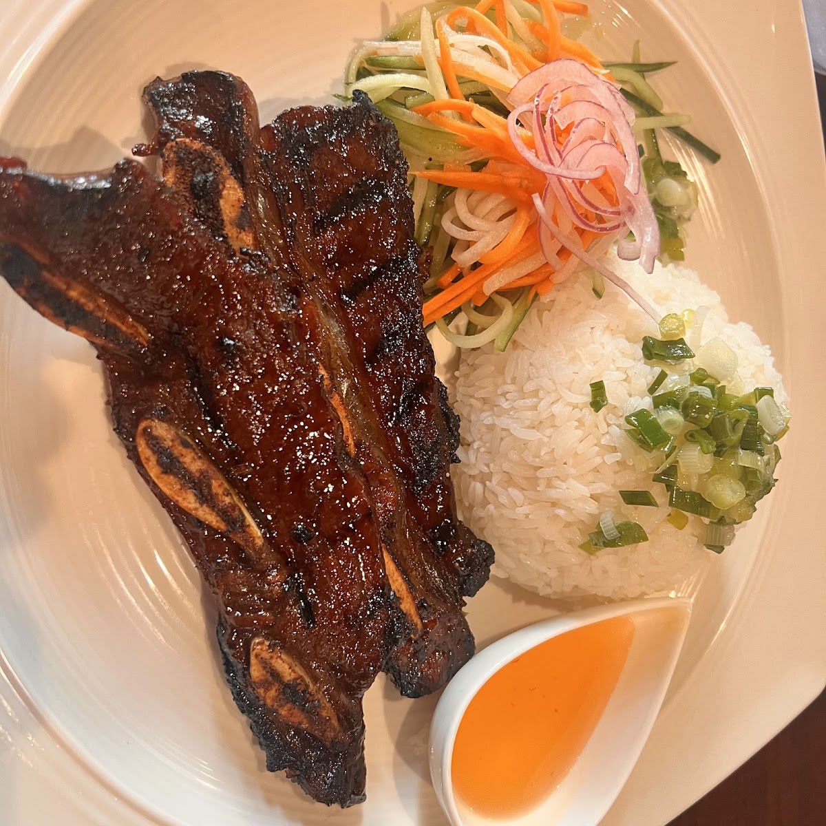 The dinner vibes here are very chill. We came around 7:30 on a Wednesday and were seated immediately. The windows looking out onto Piedmont Ave are beautiful, the restaurant is clean, and it is quiet enough to enjoy a conversation. We ordered the vegetarian noodle soup and pork chop rice plate. Plus a free Thai iced tea from checking in on Yelp. The Thai iced tea was on the sweet side but the flavor and richness hit. The vegetarian noodle soup had a variety of several types of tofu, charred vegetables, and a flavorful broth that was not too salty. There are 3 noodle choices for the soups — thin “pho-style” rice noodles, flat rice noodles, and thin egg noodles. The pork chop was huge, thin-cut, juicy, and had a nice char flavor. There were several layers of meat on the plate! The pork came with some simple veg, fluffy rice, and an acidic dipping sauce. Prices were affordable — our dinner came out to less than $18 each including tax.